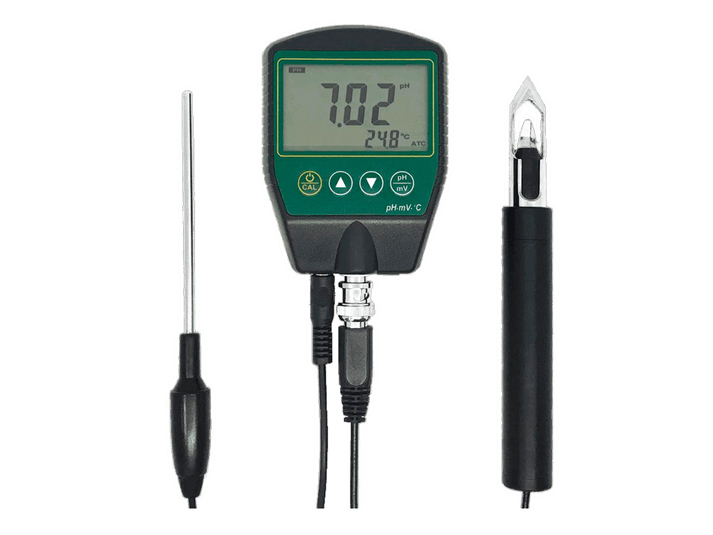 Medidor de pH digital y electrodo con cuchilla para insertar en sólidos blandos como carne y queso. Posee una sonda de temperatura para realizar la compensación automática de pH. El medidor tiene la capacidad de medir en mV (ORP) adicionando el electrodo apropiado.