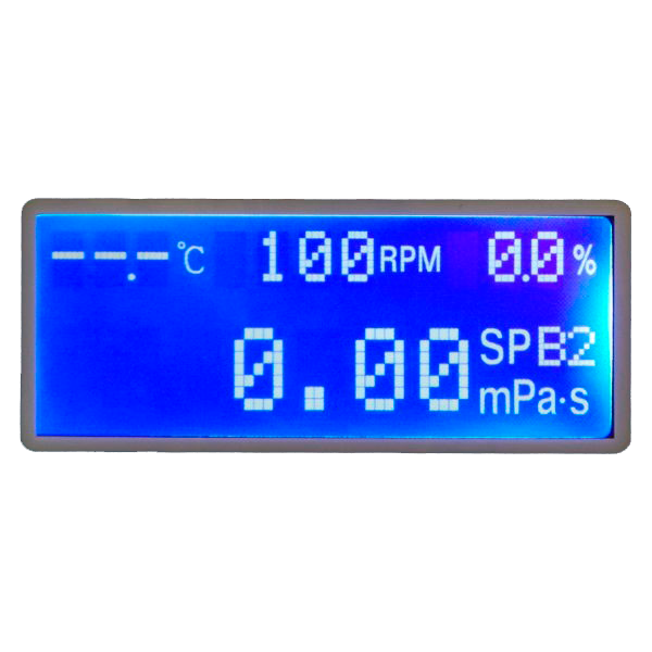 Pantalla: tipo LCD de 65 x 25mm. Visualiza: velocidad, torque, valor de viscosidad en mPa x s., número de rotor instalado y temperatura.